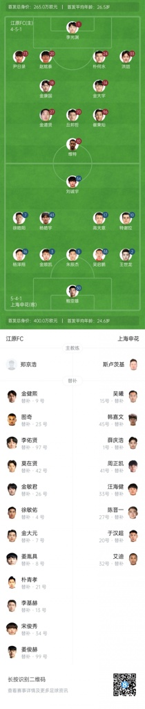 亚冠-申花客战江原首发:双方均单外援,18岁吴启鹏生涯首秀