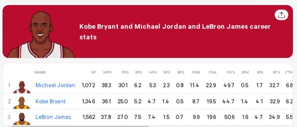 值得一提的是,科比生涯场均得分25分,老詹为27分,乔丹为30.1分。